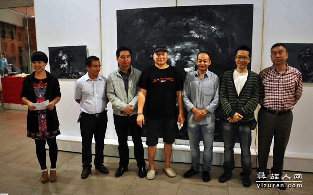 对故乡大凉山的眷恋以及对本民族文化的挚爱都给画家的作品打上了深深的烙印。在画展的前言中,画家深情地写到“您看着我的时候,其实是我看着您的时候;我的言语是来自您心灵深处的声音——”。画展中的作品多创作于2011年至今,画家在凉山村寨间的采风。人物的原型都是普通的彝族农民,这在《无题·肖像》中得以充分体现,这组作品由44副头像构成,男女老少跃然纸上,画像边彝文题写的人物故事为整个画面增色不少。《众生图》由9幅150×120cm的作品联袂,成为本次画展中最壮观之作。黑黑白白的构图,匆匆忙忙的人形,那些画面中的影子仿佛就是凉山集市上的阿妈阿米,刚刚与你我擦肩而过。《花》系列中,背景的黯淡和花海的绚烂形成反差,在展厅中产生强烈的视觉效果。远与近、动与静、明与暗的对比与彝族传统文化的二元观遥相呼应,是画家将本土认知通过现代绘画技法加以表现的创举。画展并非生活实景的重现,比如《在路上》系列,在这组作品中,画家将自己头脑中的具象肢解,并试图还原成现象的本体。所有这些画作,人物多是黑色笔触,一团团的黑色,浓缩成一个个影子。这样的艺术表现手法既新颖独特,又蕴含深刻的哲学思辨——芸芸众生,任何鲜活与精彩最后都将归于历史之尘;在无法支配自己命运的大时代,这些远离祖先庇护的人们只能悲哀地审视自己,所有的爱与恨不过是山坡上从未回头的背影。