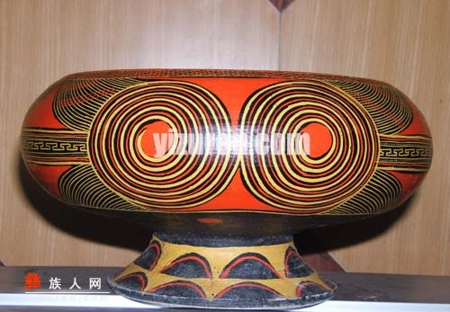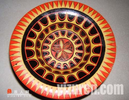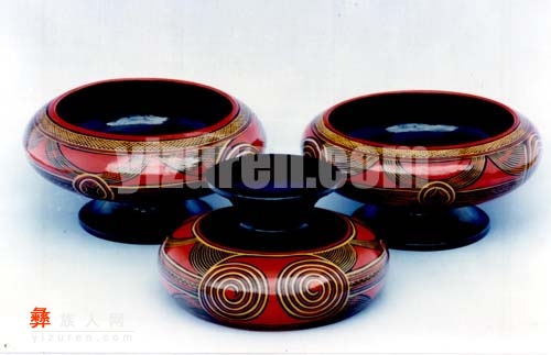 有人把彝族称之为“三色”民族,这大概是源于彝族漆器的永恒三色吧。彝族漆器用红、黄、黑三色在器物上以自己的图腾文化勾绘着整个民族的性格与气质,展示出一个民族在历史长河中的精神追求与文化底蕴。彝族漆器大多以黑作为底色,红、黄两色经过彝族民间工艺师们灵巧的双手形成一副副精美花纹呈现在器物上,简单的三色在色彩上形成的鲜明对比给人以强烈的视觉冲击,具有独特的文化内涵和艺术魅力。在封建社会里漆器属于达官显贵和富裕家庭拥有的物品,在民间很少流传极少。