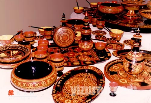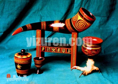 在吉伍伍且家里布满了一件件美轮美奂的彝族漆器,用于墙面装饰的有羊角、武士刀鞘、斗笠、口笛等,全家人日常生活所用的也全部以漆器“武装”,从桌、椅、碗筷、茶几到床柜,就连镜框和电话机台也用彝族漆器制作。在他家有的漆器使用年限已逾20年,除了局部地方稍微磨损脱色外,大部分色彩依然绚烂,图纹依旧清晰,成为名副其实的漆器“古董”。