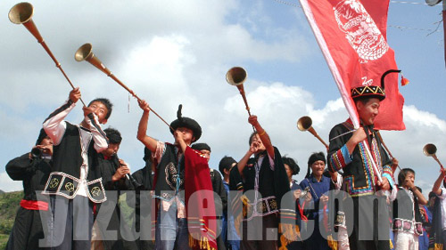 祭山的队伍大约向山上步行了800多米,毕莫挥了下手:“就是这里了”。于是,三个毕莫拿出经书,开始诵经,毕惹拿出准备好的干草和石头,用彝族最古老的方法取火,火慢慢点燃了,被放进准备好的取火专用的灯里,媒体又是一阵忙乱。穿着草裙、戴着动物面具的几个年青人开始围着火跳起舞。然后,一行人浩浩荡荡回到公路上,坐车到火把节主会场。