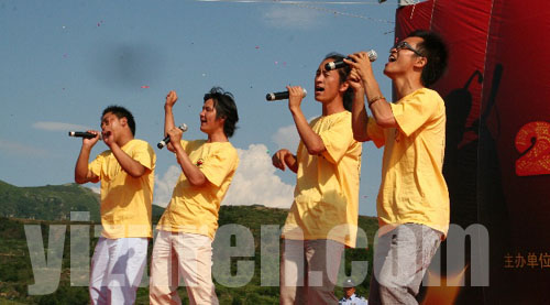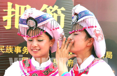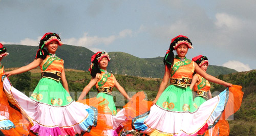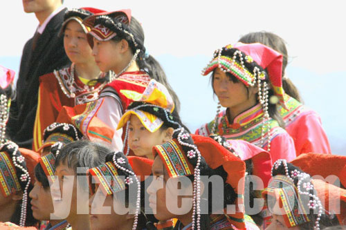 下午三时许,文娱节目开始了,舞台上用彝汉两种语言写着“大方凤山彝族火把节”,古彝文是比新彝文好看,有味道得多。首先致祭火文,男主持用彝语,女主持用汉语。文娱节目的亮点是舞蹈,编得很不错,美女们晃来晃去,把大方、奢香、百里杜鹃等用另一种方式存到了媒体的眼睛里,观众的记忆里。山火彝人做为贵州唯一的一个彝族组合,被一分为二,杨茂华带一队去了盘县,苏涛带的这队来了大方凤山,他们的《爱我彝人》《阿依姑娘》和月琴独奏赢得了观众的阵阵掌声。