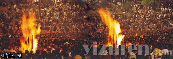火树银花不夜天!夜幕降临,一堆堆篝火点燃了!牛角吹起,长号吹起,大三弦拨响、天空中划过节日的礼花,“东方狂欢节”拉开了序幕!熊熊的火光照亮了人们快乐的脸,满场的火把将阿诗玛的族人们带进了节日的高潮!舞的世界,歌的海洋,全场沸腾了,认识的不认识的、老的少的小的、男的女的、外国的中国的……随着大三弦强劲的旋律都舞了起来,“噢噢噢”“赛赛赛”,围着篝火,里三圈,外三圈,音乐不停,歌不停,歌不停,舞不停,伸出你的手,伸出我的手,开心你也吼,痛苦你也吼,抛开一切围着跳跃的火焰,跑啊,跳啊,歌啊,舞啊,尽情挥洒释放所有的激情……