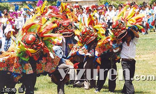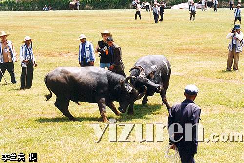最刺激的还数斗牛!浑圆油亮的大牛牯被主人拉到了场中央。我是老大我怕谁?血红的眼睛瞪着周围,刨地喘粗气蓄势以待!彝族撒尼人爱牛,特别是斗牛,主人总是用上好的饲料精心喂养。斗牛分黄牛和水牛。黄牛性格温顺,斗起来倒像两个职业运动员,先审势,再度时,再进攻,悠哉游哉打拉锯战;水牛就不一样了,体大角尖,性情暴燥,特别好斗,牛主刚拉到赛场,“仇人”相见分为眼红,直冲对手飞奔而去,只见得八蹄立地有根,四角交叉,惊天动地黄土飞扬!像它的性格来得快去得也快一样,较劲一般不会持续太长时间,失利的牛一看势头不对拔地而跑,取胜的一方不依不饶立马奋力直追!场外人山人海,手舞足蹈,呐喊助威一阵高过一阵!