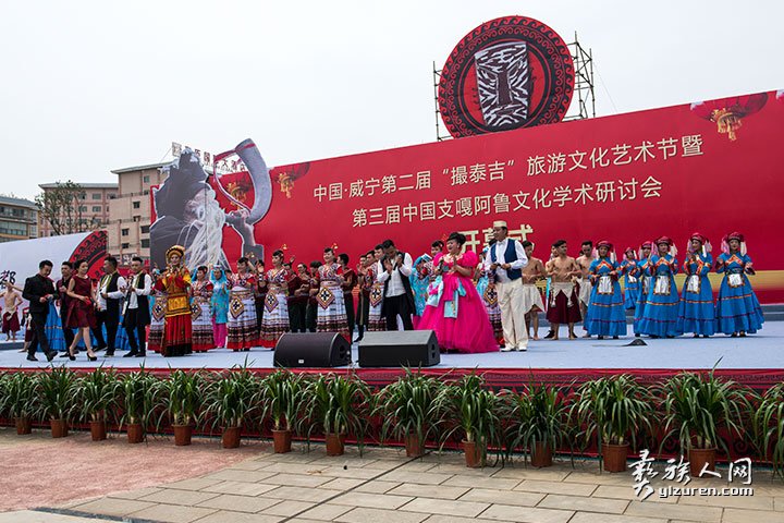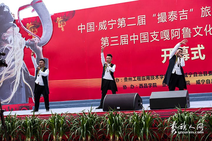 Lk9彝族人网(彝人网)- 彝族文化网络博物馆 开幕式上,与会领导及嘉宾观看了文艺演出。独具威宁彝、回、苗等少数民族特色的文艺节目精彩上演,阿鲁阿卓、奥杰阿格、马关辉等歌手倾情献唱,一台民族文化大餐呈现给现场数千名观众。Lk9彝族人网(彝人网)- 彝族文化网络博物馆