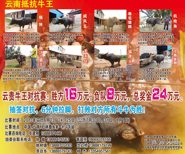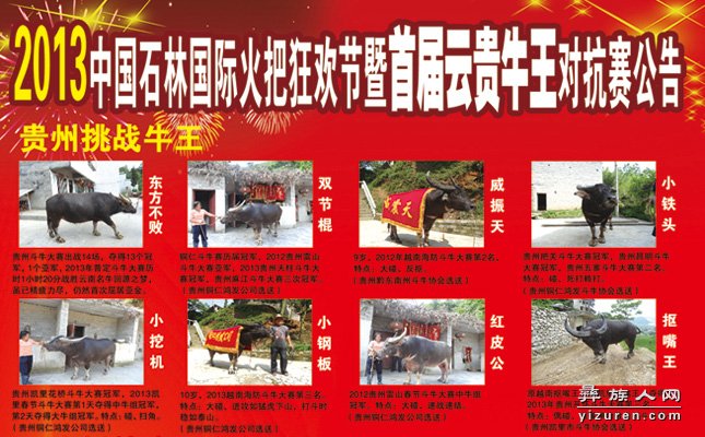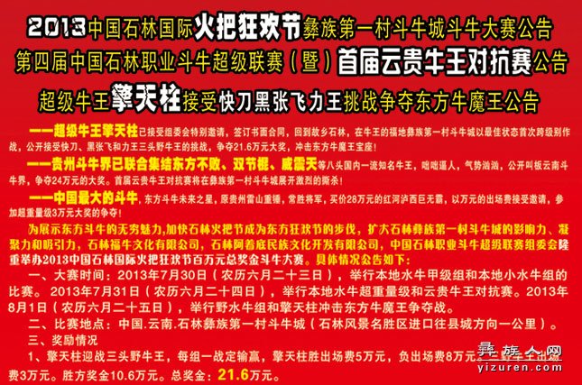2013中国石林国际火把狂欢节,彝族第一村斗牛城,中国石林职业斗牛超级联赛(暨)首届云贵牛王对抗赛即将与2013年7月30—31日隆重开战。中国最盛大的彝族火把狂欢节,独一无二的彝族特色职业斗牛大赛:w3l彝族人网(彝人网)- 彝族文化网络博物馆