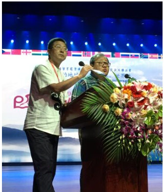 中国作协副主席、著名诗人吉狄马加(右)主持西昌邛海“国际诗歌周”开幕式