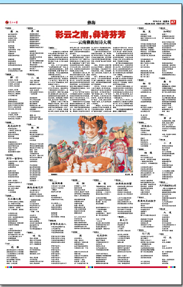 这次,又专门为云南推出“云南彝族短诗大观”专版,让人感受到这份报纸容人、做事的宽阔胸襟,浩瀚“彝海”积下无量功德,可见其总编辑超然卓群的眼光和胆识。