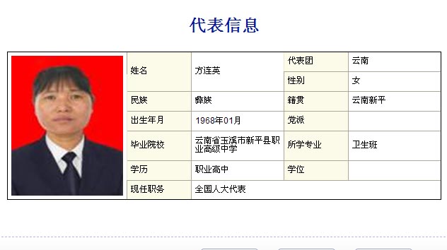 45岁的方连英是云南省玉溪市新平县扬武镇马鹿寨村玉租小组一名彝族乡村医生,作为全国人大代表,3月2日上午,她随云南代表团首次来到北京。从山沟沟飞到首都,这里的一切让她感到陌生和新鲜,但第一次来参加全国人大会议的她,心里琢磨更多的是怎样当好一名合格的人大代表。