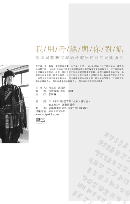 2011年12月9日,以“我用母语与你对话”为题的阿库乌雾诗歌创作研讨与朗诵会在成都市宽窄巷子白夜酒吧举行。作为四川大学近期召开的“中国多民族文学的共同发展”专题讨论会活动内容之一,本次活动由四川省中国现当代文学研究会、四川大学文学与新闻学院、四川大学文学与人类学研究所和西南民族大学彝学学院、白夜酒吧共同举办。