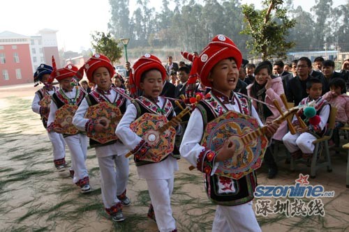 在帮扶两县教育事业的同时,招行也十分注重山区彝族青少年文化事业的发展。今年8月份,招行启动了金葵花彝族少儿合唱团,为云之南、山之畔的彝族小精灵们插上歌声的翅膀。此次赠送仪式上,这些可爱的孩子们身着精美的彝族盛装,脸上挂满灿烂的笑容,边歌边舞。伴着彝族乐器月琴独特的弦音,孩子们天籁般的歌声响彻整个校园,感染了在场的每一个人。