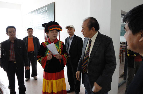 冯雅迪(左五)一行考察新建教学楼,身着彝族服装的老师介绍相关情况。