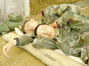 由于过度疲劳,官兵们躺在地上就睡着了。