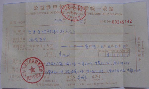 [抗震救灾]吉杰全球歌迷会向地震灾区捐款捐物