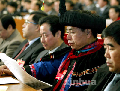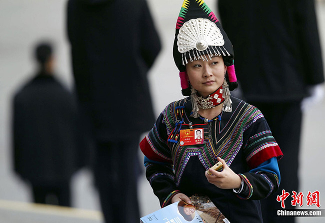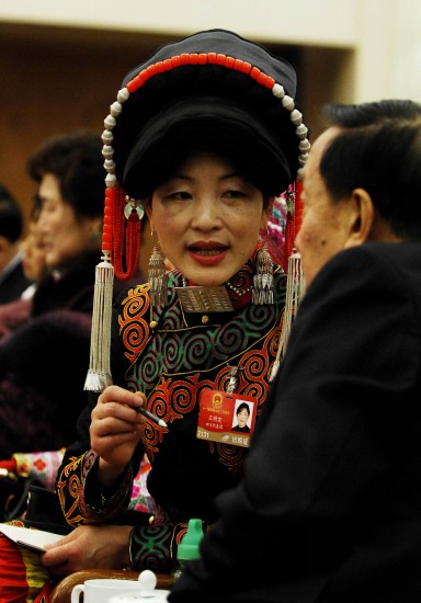 2010年3月,十一届全国人大三次会议第四次全体会议开始前,来自四川的彝族代表杨秀英(右族)和来自云南的彝族代表杨亚梅(中)、哈尼族代表李福珍(左)交流。