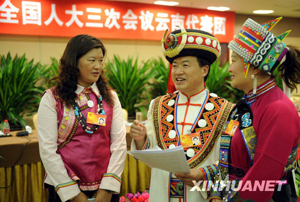 2010年3月7日,来自云南的全国人大代表王虹(彝族、右)、侯新华(傈僳族、中)和丁秀花(怒族、左)在畅谈。