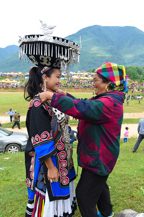 火把节上,母亲为女儿整理服饰(2016年7月28日普格县火把节)蒋志康 摄