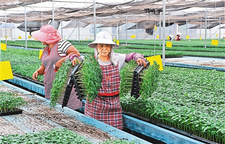 云南楚雄元谋县现代种业科技园区工厂化育苗基地内,员工在搬运种苗。(中经视觉 高迪 摄)