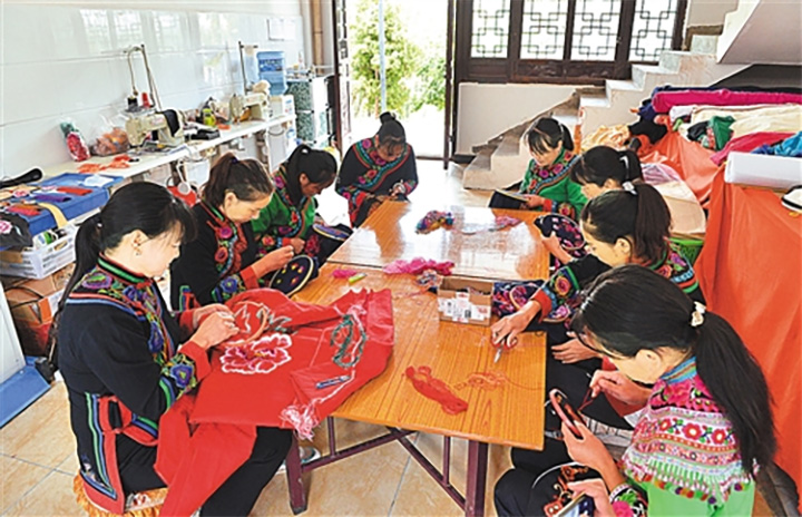 大姚县咪依噜民族服饰制品有限公司,绣娘们在刺绣。(中经视觉 高迪 摄)