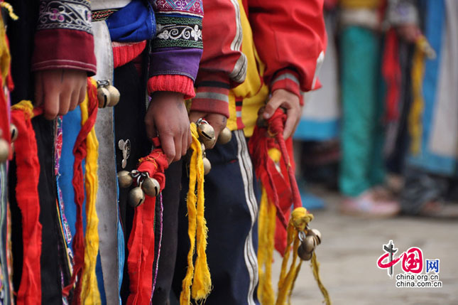 图片描述:彝族“铃铛舞”具有连歌载舞的,舞者先歌后舞,歌舞相间,舞蹈无音乐伴奏,靠鼓点及舞者摇响手中的铜铃声来统一动作,唢呐只作间隙的吹奏。通过祭祀活动,跳“恳合呗”,唱祭祀礼仪之歌,以尽子孙之孝,祭奠逝者,安慰生者。