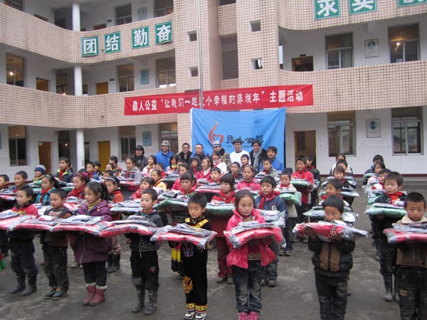 彝人公益此次捐助的冬衣(裤)共计413套,袜子、手套各200余双(副),另有数十个篮球、足球及跳绳等文体用品。在此次活动中,我们邀请了彝组合担任四川省乐山市峨边彝族自治县杨河中心校彝人公益捐助活动的“爱心大使”,并向他们颁发荣誉证书。因档期原因,阿四龙组合、彝人传奇组合等“爱心大使”未能亲自参与活动,但他们的热情和爱心同样值得铭记。在这次活动中,彝人公益还得到了贵州省《毕节日报》的蒋凤、云南丽江永胜县卫生局的木森海帆、四川省乐山市俄边彝族自治县的阿索拉毅及四川省凉山彝族自治州会理县的“十二橡树雨”等爱心人士的无私帮助和支持。