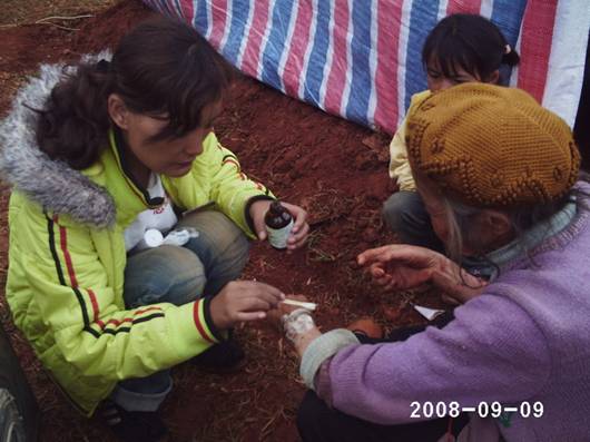 李晓兰和俄的日火两个人负责外联工作,他们每天都要给中心办公室、当地村干部、乡干村、援助机构和新闻媒体打很多的电话,组织队员们在当地干部统一部署下完成各项工作,把绿湾村的灾情及时地告诉外界,让更多的人可以来关心和帮助灾民的生活。