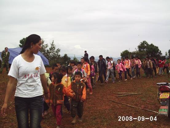 每天,志愿者们都要来回走半个小时的路程去各个生产队的路口或者家里去接送学生,有的年龄小的要一路背到营地去上课,放学时要背着送回家里。有一个在地震中腿部受伤的女孩每天都要来参加活动,家长和志愿者就轮流背着她往返。