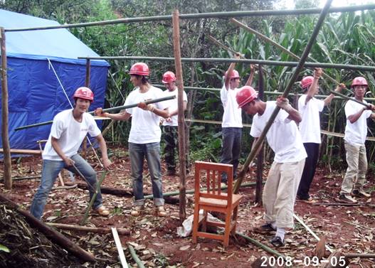从9月3日起,救援队按照工作部署分为工程队、教学组、后勤组、外联组等,立即投入到抗震救灾的工作中。此后,救援队在营区先后建起了男女营房、厨房、儿童教室和活动区、取水处、男女厕所等设施,并在相应位置用标牌进行了标示,救灾营地和队伍的管理也日趋有序规范。