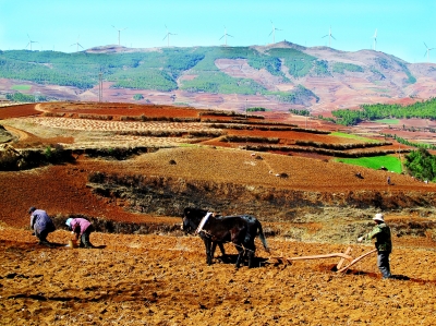 2014年立春刚过,滇中大地雪后放晴,蓝天白云,春阳暖土。尽管农家小院还挂着腌制的年猪,门前贴着喜庆的红联,可农家人已从节庆的欢乐中走向田野,开始了马年的辛劳,真是“杜宇一声春去,树头无数青出。”到处一派春耕的繁忙景象。