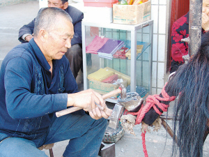 “先给哪个蹄子挂掌,就用一根细绳把这只蹄子绑在木桩上,把蹄子放在马蹬上,这个动作就叫翻蹄亮掌。”老李先是抬着马腿将马蹄放在自己左膝上,很细心地把磨薄磨坏的旧马掌撬掉,拔净上面的钉子,右手才抄起镰刀开始为马修“脚”,修好后,他左手拿着做好的马蹄铁和马蹄钉,右手握着小榔头开始钉掌。此时的灰马极为躁动,马的主人在一旁不住地喝斥。老李娴熟地将马钉一一钉入,不时,他还要用勾型工具旁敲几下,确定四只马蹄铁完全固定,这样一套马掌就钉完了。一看时间,技艺娴熟的李存忠钉一匹马的马掌只用了半个小时。
