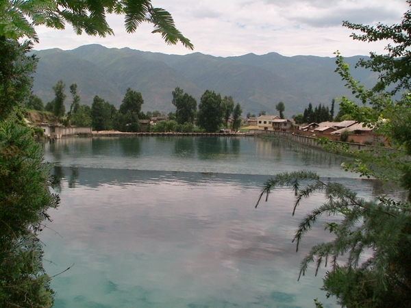 先说水镇之水。只要走入中所古镇,就是走入水乡,中所最美最具代表性的当然是水观音河水了(相传文昌帝君张亚子修行时在此河遇难,得观音显灵搭救,后人为感激观音菩萨救苦救难的惠泽,改此河为水观音。过去水观音河源地龙泉口还建有“观音寺”)。水观音的水是地下水,发源于中所镇西头的金马山南麓,山脚缝间多股清泉涌出成河,因鱼随泉出,又称之为“鱼洞河”。鱼洞河水面宽阔,水深丈余,成一小湖,资料上说:“泉水清可见底,洁可数鱼,冬暖夏凉,恍然有气,天阴将晴,则轩然有声,夏秋涨发,无浊浪横波。”此水有“四绝”,一绝是至清至澈;二绝是冬暖夏凉;三绝是久雨欲晴时,出水口将传出隆隆吼声,如千军万马奔出,意示晴天将至;四绝是水中有细鳞鱼,味鲜养人,属“雅鱼”系列,是上好的滋补品。说起鱼,当地人都会夸口说,以前鱼洞河,站在岸边用水瓢都可舀鱼,大的有二四尺长,想吃鱼,端上锅烧上水,然后到沟边舀鱼,回来时水都还没有开——可见鱼真不少。今天这里已不是自然形成的小湖,而是一个水电站的拦坝,湖更大,水更清更蓝更深,可谓是水天一色。