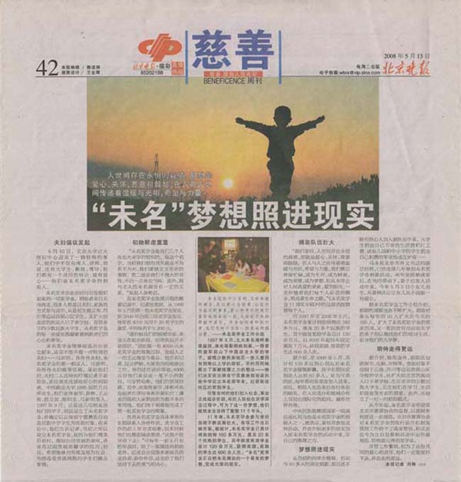 未名这份不计名利、无私奉献的事业,是以爱心为纽带、以信任为基石的事业,爱心和责任把我们紧紧地联系在一起,友谊在无私的奉献中成长。作为初创者和执行者,我们无时不为每一份真诚所感动着。