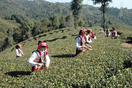 出了万亩竹海,就是彝人谷的另一道景观——峨山高香万亩生态茶文化旅游区。刚进茶园,一畦一畦的茶树跃进了我们的视野,远远望去茶园如梯田般美丽壮观。夏季的茶园散发着淡淡的香气,透出一股高雅和清新,辛勤劳作的彝家姑娘,正在忙碌地采茶,带给茶园一片别样的生机。
