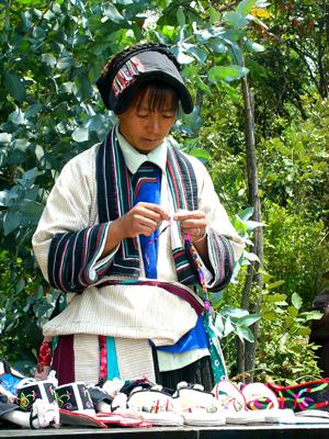 不料坟林边的摊点也不少,花花绿绿的挂满了商品。具有他留特色的手锈或纺织的背包、钱包、布鞋等都很漂亮。一群摄影师正围在一个摊位面前拍照,摊主是一个他留妇女,30来岁,前面摆放着她亲手纺织并手绣的布鞋和鞋垫,手工精细,生意很好,加上身着盛装的摊主热情大方,很快就成了顾客和摄影师们关注的对象,也难怪,在这样一个他留人的民族盛会里,她们无疑是人们关注的中心和焦点。