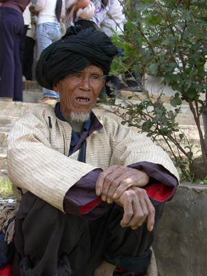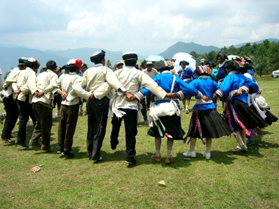 当我们抵达时,他留山已是一片人山人海,窄窄的山道、碧绿的草地,盛装楚楚的人们为了等待这个节日,仿佛积蓄了很久,都迫不及待地三两成群,五六成伙地聚在一起,闲话家常,谈天说地,好不热闹。那些颇有眼光的商贩也抓住这大好时机,把吃的,喝的,玩的……各种各样的商品带到了这里,很早就开始摆摊设点,汇聚成了一个热热闹闹的小商品市场,那些红色的阳伞,那些色彩缤纷的民族服饰,那些涌动的人群,仿佛一条彩色的河流在流淌。我像一滴阳光下的水珠,汇入了人潮组成的河流之中,涌向他留坟林。