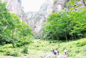 进入梦幻谷,两边的山崖如刀切一般。灰白色的山崖间并非一毛不长,各种姿态的古树、奇松在悬崖峭壁上,有的一株傲然挺立,有的两株、三株拥在一处生机蓬勃。梦幻谷底部地势比较平坦,空间或宽或窄,最宽的地方不超过200米,而狭窄之处顶多20米。抬头前看,两边的山崖合在一处,天衣无缝,正是“山重水复疑无路”,而当你到达两壁合拢处,却是“柳暗花明又一村”。