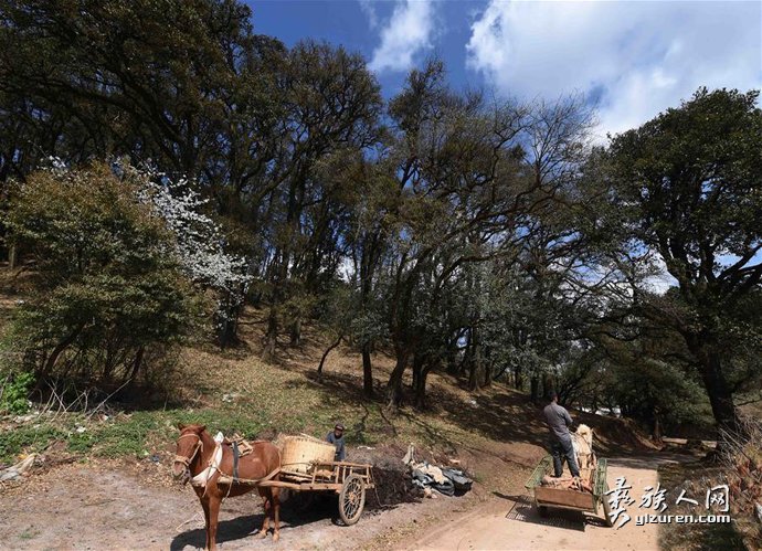 2016年4月6日,彝族群众经过“密枝林”,运送耕种的农肥。在云南省寻甸县甸沙乡苏撒坡村,有256户共1117名彝族群众居住在密枝林保护小区附近,成为该县彝族人口集聚最多的山寨。“密枝林”占地246亩,有五角枫、紫花卫矛、川滇山栎、杜鹃、槲栎、白栎等多棵三百多年的古树。当地彝族群众祖祖辈辈爱林护林,使这片珍稀的古树林至今保存完好。