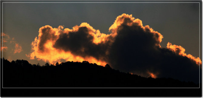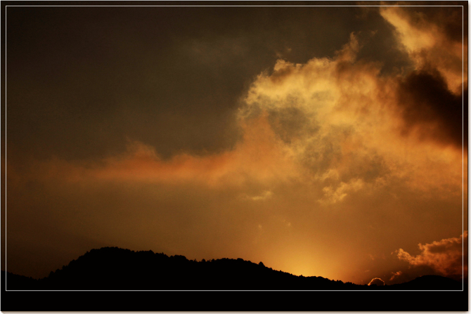 太阳终于在天与山的空隙里露出脸来,霎时,天空刚刚才显现的蔚蓝被染得通红,云朵也幻化出金色的边来,那一刻,天地间充满了温暖的光,就连翻卷的云海 也安静下来,如水一般荡漾在山峦与谷壑间,高高低低的林木不时的探出头来,宛如云海里星星点点的岛屿,远远地村庄也绽出舒缓的笑脸。