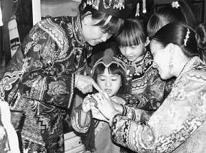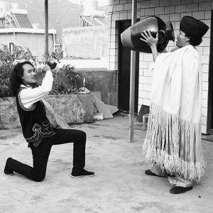 图1:朱润新将荣获亚洲国际新专利评选博览会金奖的双人杖笛,拿岀来和妹妹朱润梅吹奏。