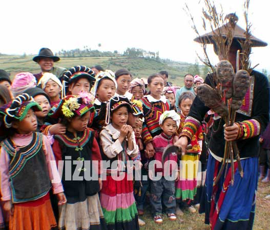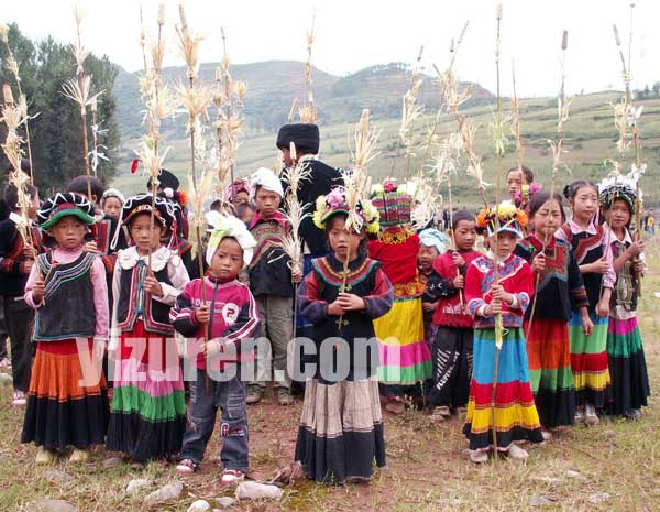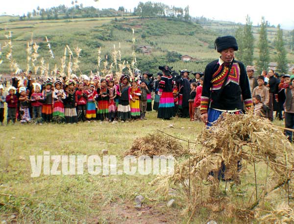 最后,用孩子们的刀枪在和旧扫把插在东北方(彝语称达布龙门,说是鬼怪居住的方向),以阻挡鬼怪前来扰乱或袭击村里的儿童。