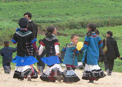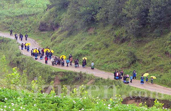 姑娘们都撑一色的黄油布伞,于是整个山坡被黄色覆盖,十分壮观。彝人姑娘以黄脸蛋为美,自古就有用荞粉调糊擦脸的风俗。黄油布伞下的姑娘被一片淡淡的黄光笼罩,自然楚楚动人。