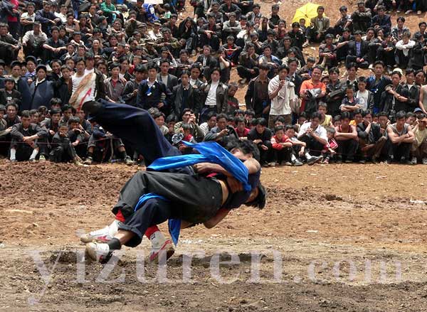 彝族传说火把节的来历是天上的大力士被地上的大力土摔跤摔死了,天神被激怒后放蝗虫来吃地上的庄稼,人们用火来烧蝗虫而得来的。可见彝族摔跤的历史已相当久远了,各地摔跤形式特点别具特色。