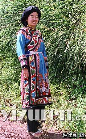 路南式:主要流行于云南省路南、弥勒、丘北、昆明等地区。男装多以布为料,传统的火草、麻布衣民间亦有穿用。款式为对襟上衣,外套坎肩,下着宽裆裤。女装以前短后长的右襟衣、中长裤、系腰裙、饰背披为主要款式,服装色调多为白、浅蓝等色。弥勒女青年则喜穿用黑白两色大面积镶拼而成的上衣。妇女头饰有地区差别,昆明市郊女青年戴鸡冠帽,弥勒女青年则以双辫缠头并包黑巾,路南、圭山妇女的头饰布箍则为本式服装的突出典型。布箍的色调及装饰因年龄、地区而有差异,路南年老妇女用黑、 红二色的箍围,青年妇女则用多色。姑娘的布箍在双耳部位立有一对三角绣花布片,脑后吊一束串珠垂向胸前。传说这种布箍头饰是仿天上的彩虹制作的,用以纪念――位投火殉情的姑娘。足饰多为尖鼻绣花鞋;佩饰有铃纹挂包、麻线挂包、挑花挎包、挑花腰带等。