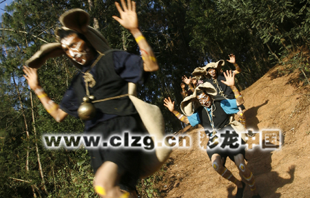 在“老虎笙”舞蹈之前,首先进行的是“傩面具舞”,据介绍此舞蹈是为了祭祖请虎,驱邪赶鬼。毕摩(“毕摩”是彝族文化的传承者,是彝族中得高望重之人)带领的师公师母们戴着夸张的彩色面具,手持木棍“神仗”进行简单的舞动,主持仪式的毕摩最抢眼:他手中的神仗是羊头与蛇身的组合,“这是我驱邪的法器,做毕摩越丑越好,这样才能吓走鬼。”这位做了10多年毕摩、脸色黝黑的李俊笑着说。