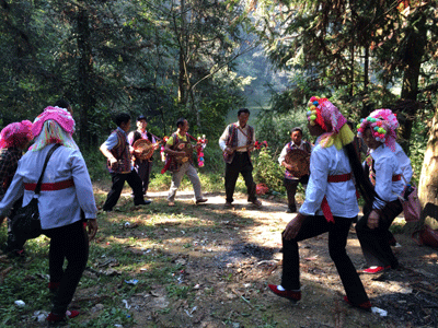 在冷泉镇神秘秀美的绿翠潭,当地彝族群众着盛装表演了冷泉山歌小调《高山腔》、《雅哩谟》,民族舞蹈《三步弦》、民族乐器小三弦、四弦等,欢声和歌舞回荡在绿翠潭的山水之间,深深的震撼着文化馆人员的心灵。