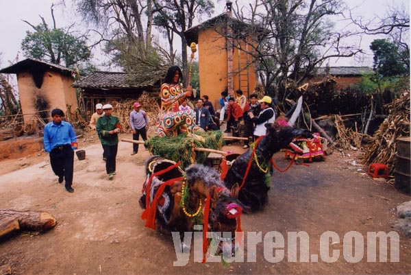 下午四时,祭“火神”的时刻终于到了。毕摩带着村中几位寨老默默地来到村中一棵大树下,搭好祭台,摆上祭品,开始诵经颂扬火神“木邓”的功绩。几位五色人抬着“火神”来到大树前,寨老们将一根一米多长的木棍,插入一个有小洞的枯木中,齐心协力的搓动着,这时有几位五色人加入,加快了木头的磨擦速度,一阵猛烈的转动后,放在洞口的火草被摩擦产生的火星点燃冒出一股青烟,人们高兴地叫到:“钻出火来了,钻出火来了!”寨老们一边吹旺火草上的火,一边拾柴火放在上面。钻木取火成功后,毕摩将取得的“火种”移到火神下的火盆里,一年的新火也就这样产生了。接下来就抬起火种和“火神”去给村民们送新火了,祭火队伍在鞭炮、锣鼓、牛角号和人们的欢呼声的护送下,顺着村头开始挨家挨户送火神,早在门口等候的主人,看见送火队伍过来,便迅速向前,向火里洒酒,把准备好的供肉放在火盆里,同时把新火带回自己家中。绘身、穿着怪异绘身的游村队伍一边为“火神”开道,一边用变调的彝语不停地喊着“木邓赛鲁来哟喝――哟……”