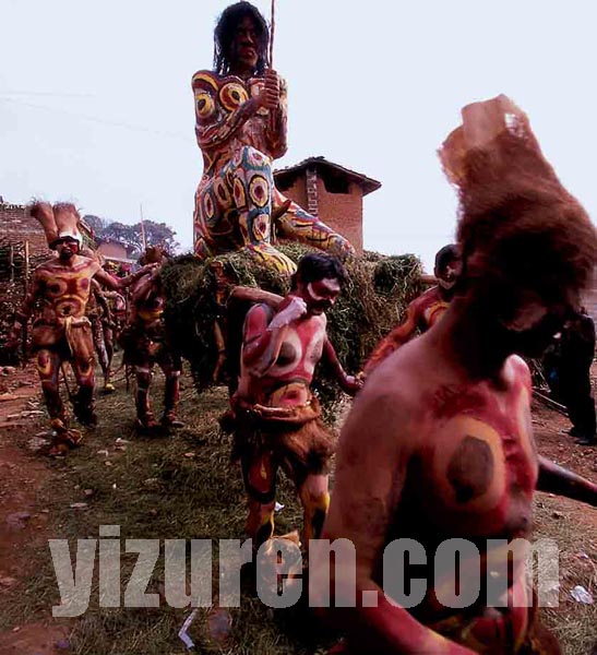 吃过午饭,祭火的准备工作已接近尾声,毕摩与几位经验丰富的老人已给纸糊的火神描身画眼,并佩上木刀、松果等装饰物。村后树林中化妆师在紧张地用红、黑、黄、白、褐五种颜色,给青年男子和小孩描面绘身,用这代表五种土壤的颜色绘身,是期盼富饶的大地来年能提供累累硕果。绘的图案大都是五色连环与虎豹等动物的纹理,前胸、后背、头、脚趾、小孩的屁股都成为绘饰的好地方。五色圈内的斑点象征日、月、星辰和光芒四射的火苗,各种动物图案则反映出阿细人的崇拜。绘过身的男子腰部用棕叶、棕片、地板藤、麻布等编织的“裙服”围住,头上则用野草、野果、树皮装饰一番。小男孩则一丝不挂地全裸着,只在头上戴着用柳条编成的帽子。化妆完毕,绘身人就来到毕摩家,静静等待祭火狂欢时刻的来临。