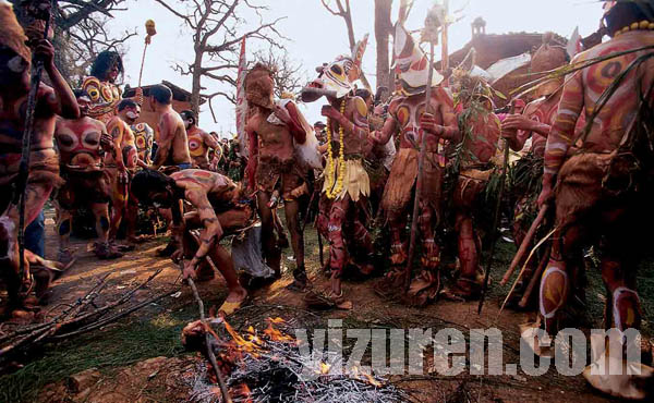 等村民们取完火种,送火队伍就将“火种”、“火神”请到寨中最大的场院上,点燃篝火,拉开了祭火活动中最为精彩的跳火神仪式,只见那些性情高涨的绘身人或纷纷舞起木刀、木杈和棍棒,或击碗敲盆,高喊“木邓来啦”,并簇拥着“火神”冲向四面八方。有的绘身人则扮作小丑,手舞足蹈地跑、跳、做怪脸、他们极力地扭腰摆胯,做出千奇百怪的动作来引逗旁人,把热闹的气氛推向高潮。纹身遮面的男人们摹仿各种动物的神态即兴表演,狂舞纵欢,有的用小筛子做月琴,短棍做笛子,长棍当二胡,不管手里拿着什么物件都成了“乐器”,而乐声都是从人们嘴里发出来的;有的男扮女妆为夫妇,怀抱假娃娃,嘴里哼着即兴自编的歌谣;有的呼叫着踩火堆、跨火栏、射火箭、转火磨、闯火阵,就在这种欢乐的气氛中,人们恋恋不舍地将“火神”和自己手中的“兵器”、“乐器”投入篝火。意味着污秽邪魔已被火烧尽,“火神”会保佑来年收成有余、人寿年丰。