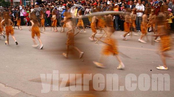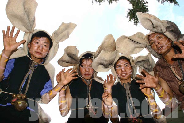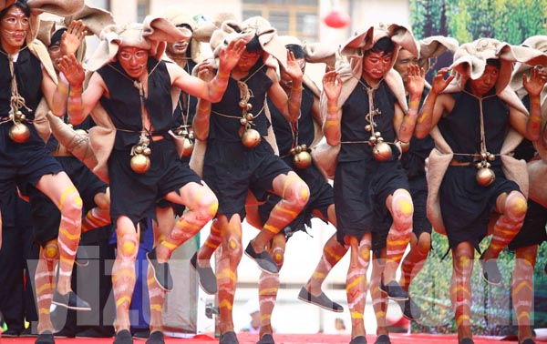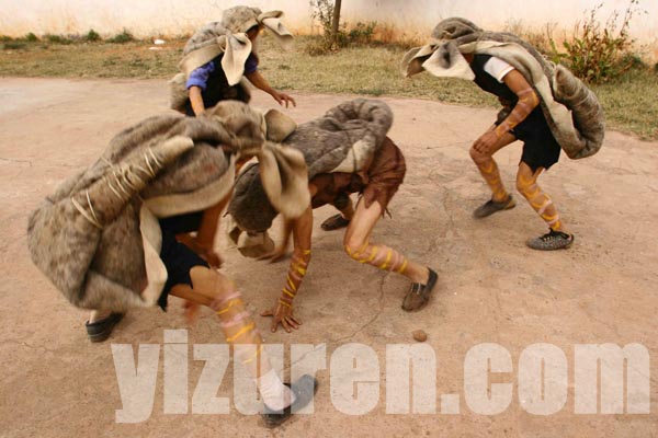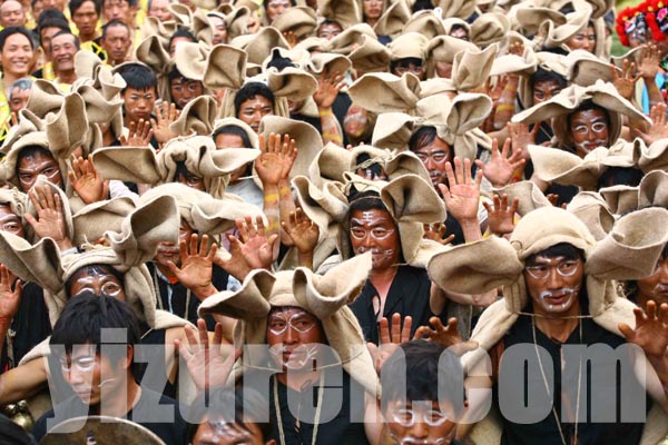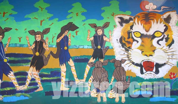 跳虎前人们有红黄白三色在手脚和面部绘上虎纹