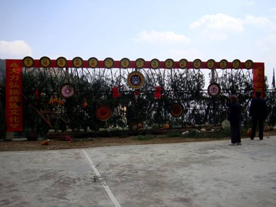 随后进行的种种活动,将神圣、神秘的宗教仪式场域,从狭小的场域中拓展到公共活动场所,参与的各种社会群体的增多,显然这种场域的拓展也不仅仅是地理空间的拓展,更主要的是社会空间的拓展。宗教仪式从神坛上走下来,在国家在场的背景下世俗化,形成新的文化空间。假“密枯”树在观音寺的右侧斜上方,在公共场所篮球场的上方,整个视野更宽阔,在表演结束后仍然留有仪式痕迹。举行宗教仪式中,场域是构成其核心的区域。世俗化的“接密枯”宗教仪式还有一个重要场域是彝族刺绣展示区和比赛区域。整个活动全部迁移到篮球场上,有利于各种表演的开展。广场上举行的仪式活动对外公开,不仅重新操演了一遍“接密枯”仪式,而且其盛况并不亚于早上神圣的仪式。而且,整个仪式基本上没有做任何删减,族人认为真是因为“密枯”保佑范围有限,接来的“密枯”应该留在这里,庇佑族人,因此还特意送一个假的“密枯”上树。在世俗化过程中,“密枯”树左上方,还有锣鼓直接配合祭祖词的吟诵。