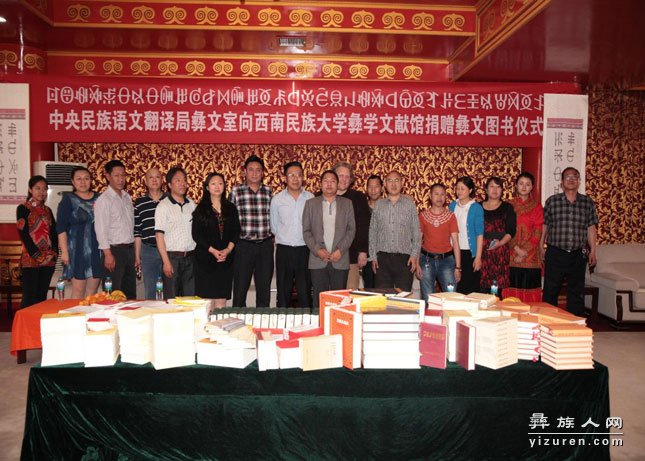 2014年5月12日下午,中国民族语文翻译局彝文室向西南民族大学彝学文献馆捐赠彝文图书仪式在西南民族大学航空港校区彝学文献馆隆重举行。出席这次捐赠仪式活动的领导有:中国民族语文翻译局彝文室主任沙马吉哈译审、副主任罗拉各副译审、翻译一科科长阿说尼古译审、翻译二科科长李日武翻译、办公室主任马小青同志及朱阿英副译审。西南民族研究院这边出席活动的有:西南民族大学西南民族研究院分党委书记、西南民族大学少数民族古籍文献研究中心主任刘勇教授、TBRC技术总监杰弗先生、综合馆、数字化馆馆长和继全、文献中心巴多教授、摩瑟磁火副教授、益西拉姆助理研究员、秦艳助理研究员及文献中心其他工作人员。
